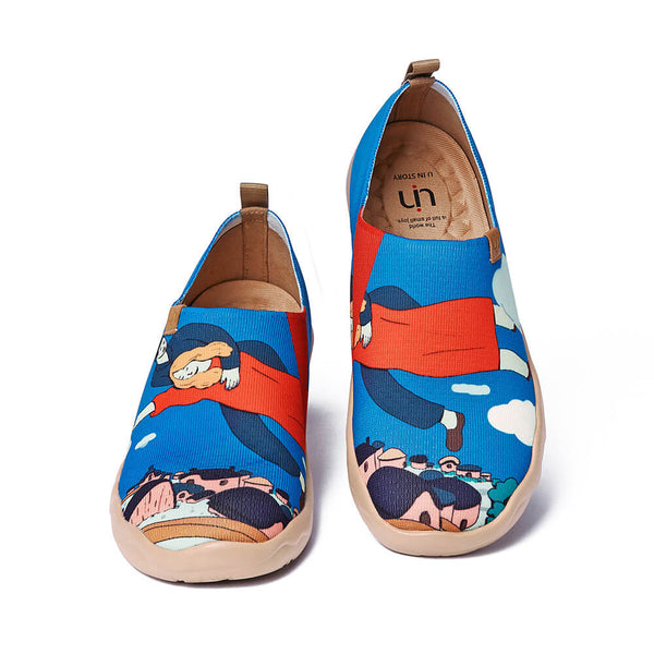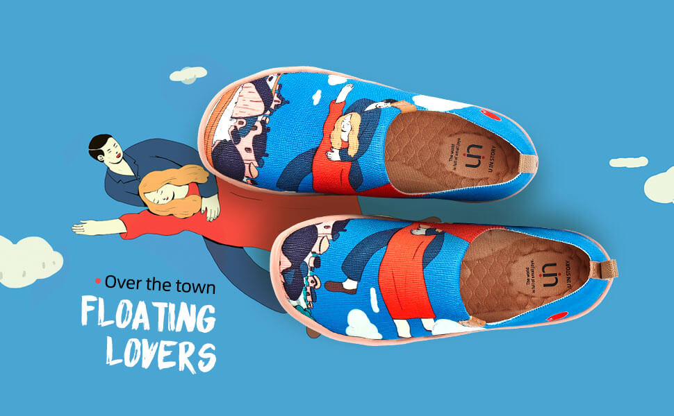 A very original and daring idea for shoes that nobody has ever tried before. Impress everybody with this masterpiece that communicates freedom and art love. It portrays two people hugging each other flying over a city, making you feel timeless and weightless.?