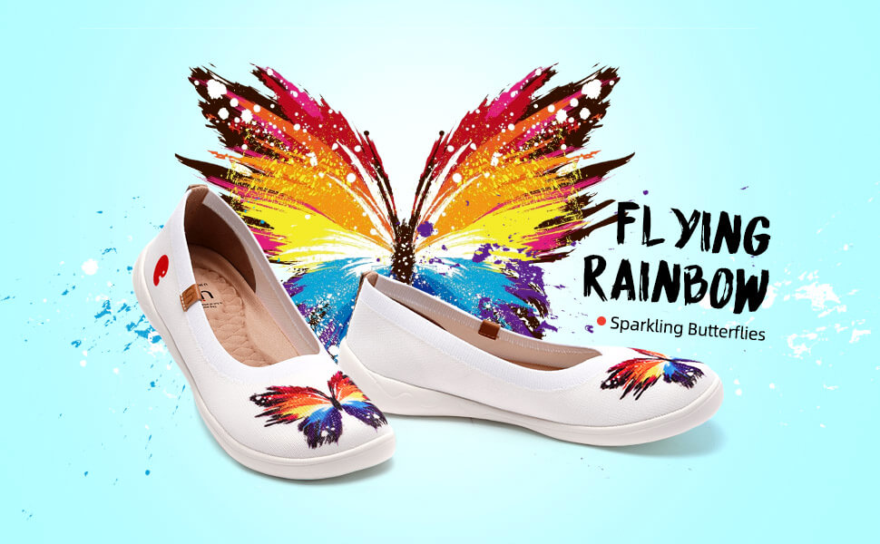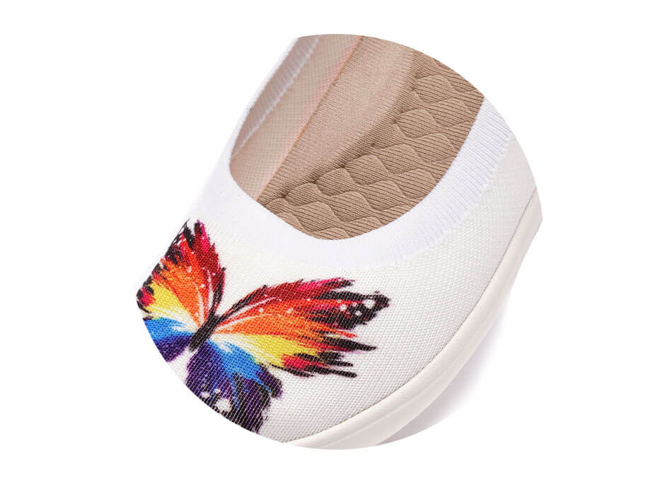 Did you know that many kinds of butterflies have developed bright colors on the wings just in order to be spotted by their partners? We used the very same natural principle to make your shoes extra eye-catching with two beautiful butterflies one on each shoe, with all the colors of the light on their wings, with a bright white background that makes them even more striking.